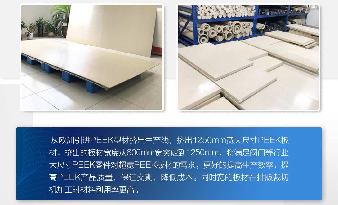 可挤出宽1250mm的PEEK板,现有几十种规格的挤出模具,规格齐全,常年备有库存,可按照客户要求进行初步裁切后发货。如有大批量需求,公司可配合客户开发指定形状尺寸的挤出模具。